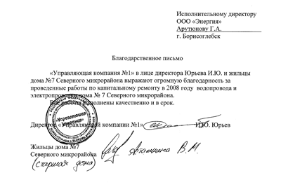 "Управляющая компания №1" в лице директора Юрьева И.Ю. и жильцы дома № 7 Северного микрорайона выражают огромную благодарность за проведенные работы по капитальному ремонту в 2008 году водопровода и электропроводки дома № 7 22 Северного микрорайона.