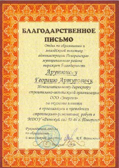 Отдел по образованию и молодежной политике администрации Поворинского муниципального района выражает Благодарность Арутюнову Георгию Артуровичу, исполнительному директору строительно-монтажной организации ООО «Энергия» за оказание помощи в организации и проведении строительно-ремонтных работ в МДОУ «Детский сад № 4» г.Поворино